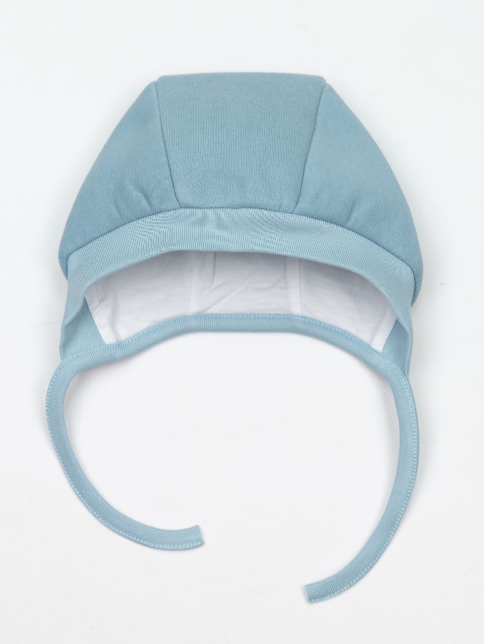 Шапочка для малышей с завязками выполнена из футера 3 нитки с начёсом (80% хлопок, 20% полиэстер) со 100% хлопковым подкладом. Плотно закрывает уши малыша, комфортно сидит на голове, не сползая на глаза. Хорошо подходит для весенних прогулок.