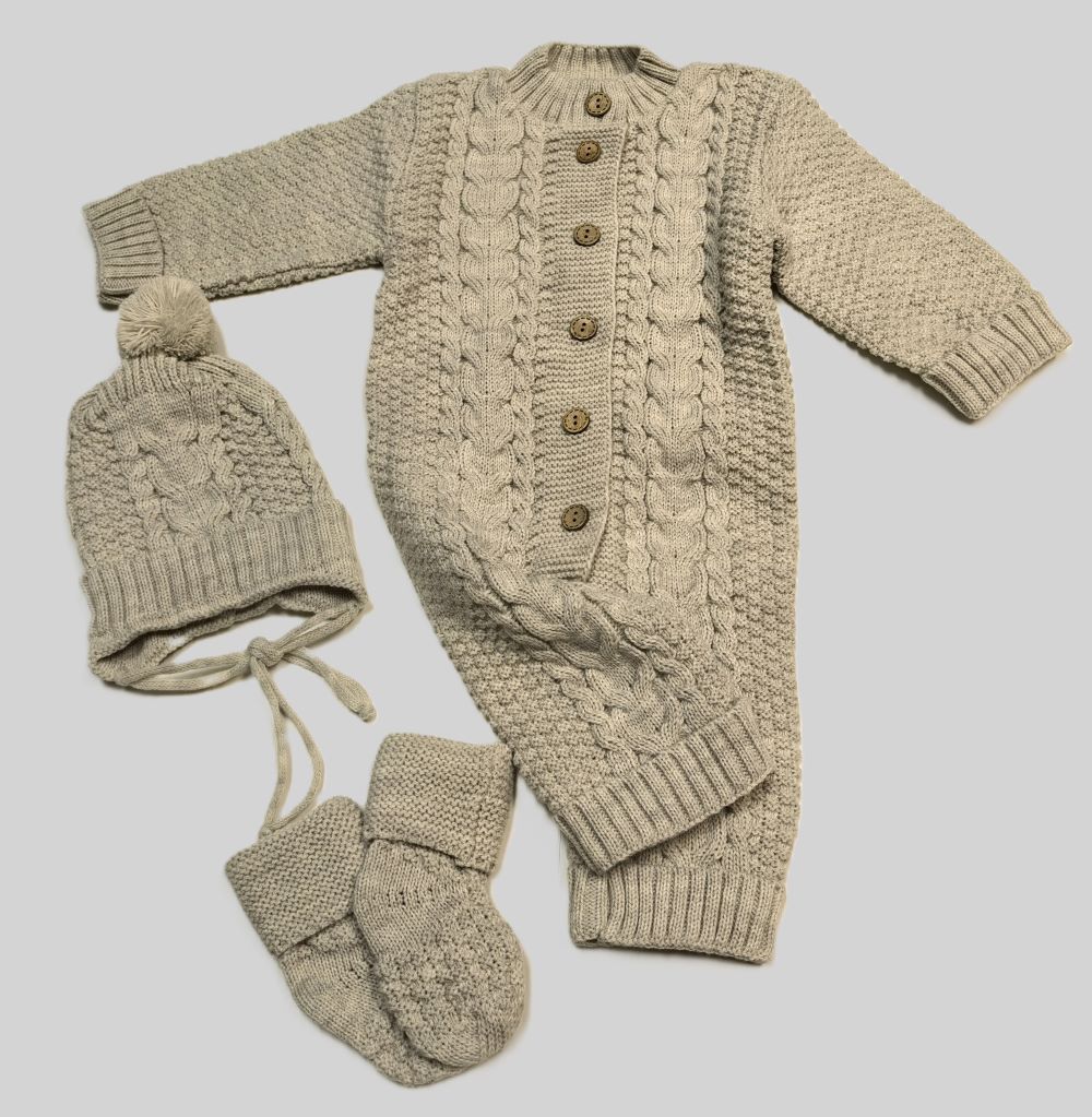Стильный вязаный комбинезон для малышей, с шапочкой и носочками. От 1 до 3 месяцев. Мягкий , приятный и нежный на ощупь комбинезончик. На ножках и ручках открытые манжеты, которые можно подвернуть по мере роста малыша. Состав: 50% хлопок/ 50% акрил