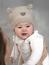 Мягкая шапочка с забавными "ушками" на макушке для новорожденного. Верхний слой связан из полушерстяной мериносовой пряжи, нижний из хлопкового полотна, внутри-утеплитель. Цвет свело-бежевый.